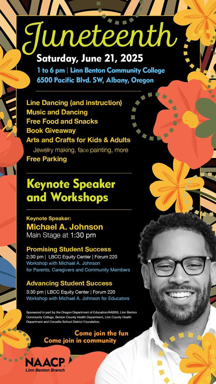 This event is presented by the NAACP Linn Benton Branch and sponsored in part by the Oregon Department of Education AABSS, Linn Benton Community College, Linn County Health Department, and Corvallis School District Foundation